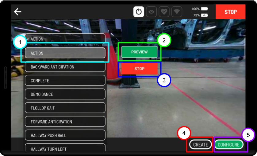 The Stop button will stop the robot if it is currently performing a previewed choreography sequence.
