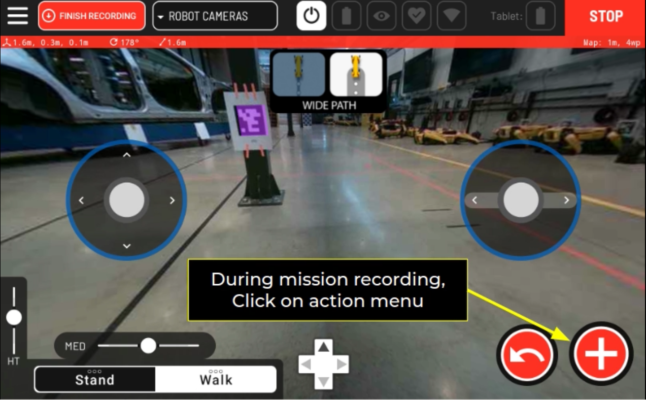 To begin, start a recording for a new autowalk mission using the tablet. Navigate Spot to where you want your first choreography action to start and click on the action menu:
